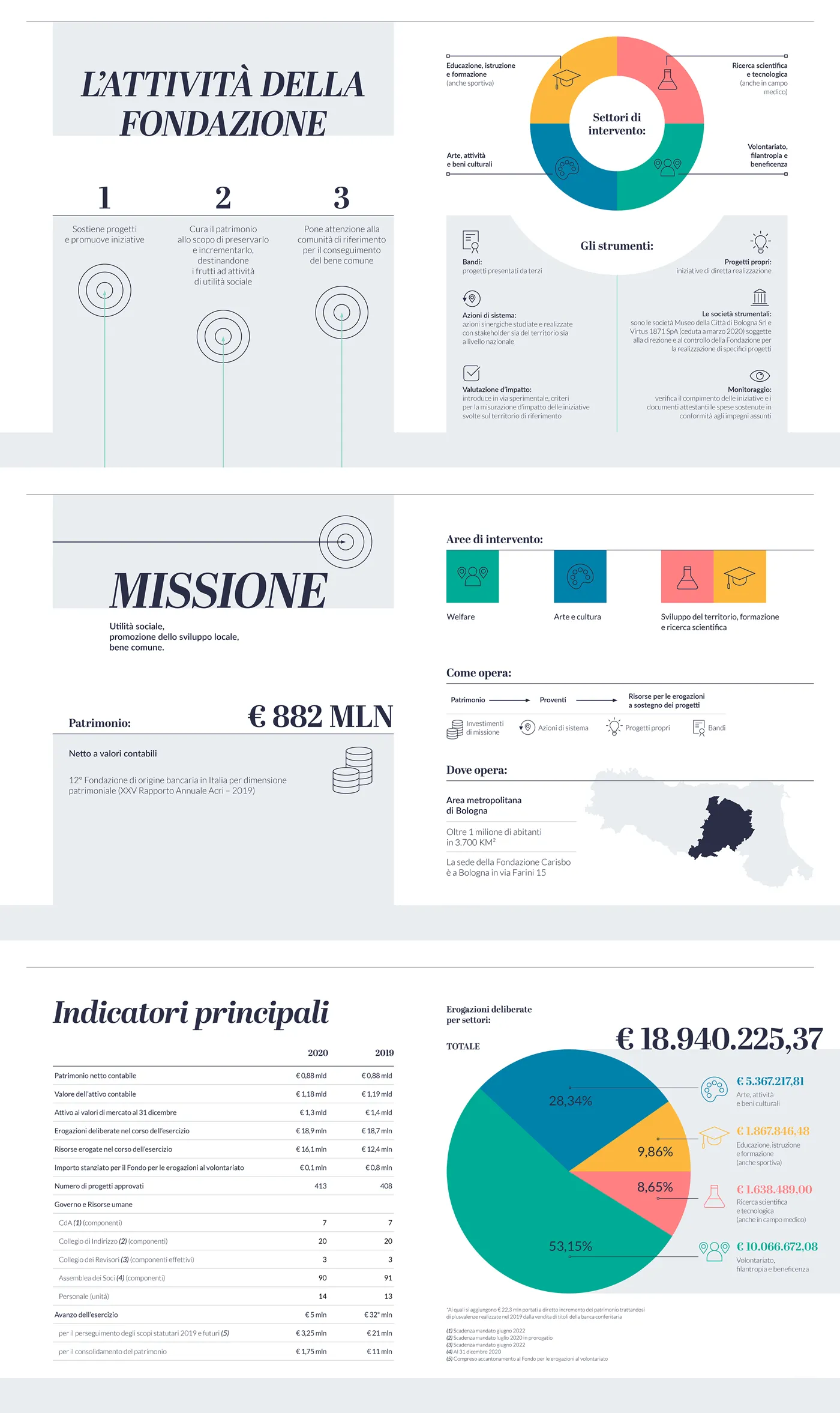 Bilancio di Missione 2020 Fondazione Carisbo Attività grafica - ADV web Settore istituzionale Nuova collaborazione con Fondazione Cassa di Risparmio di Bologna per la realizzazione del nuovo Bilancio di Missione 2020, quest'anno anche in versione digitale navigabile.