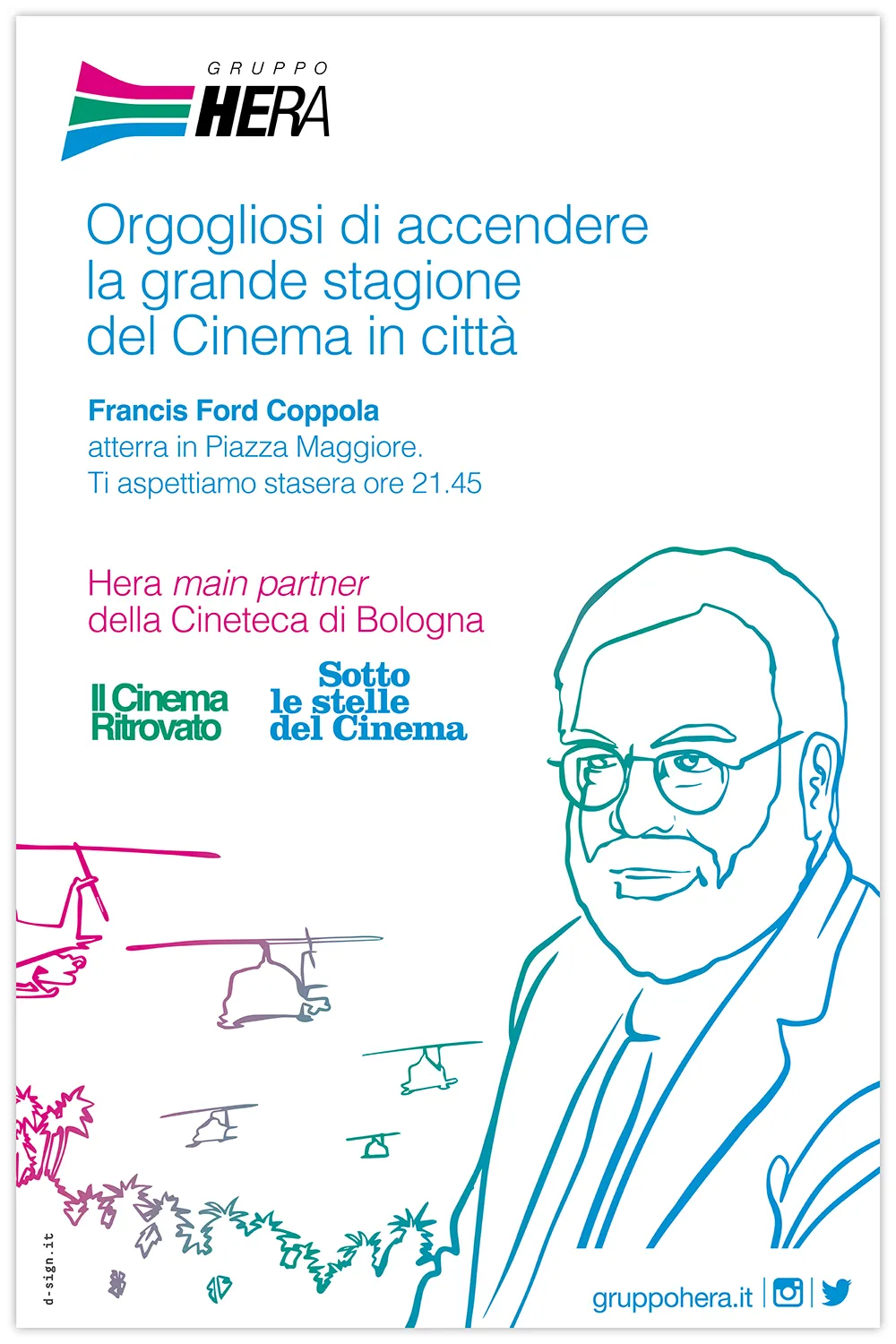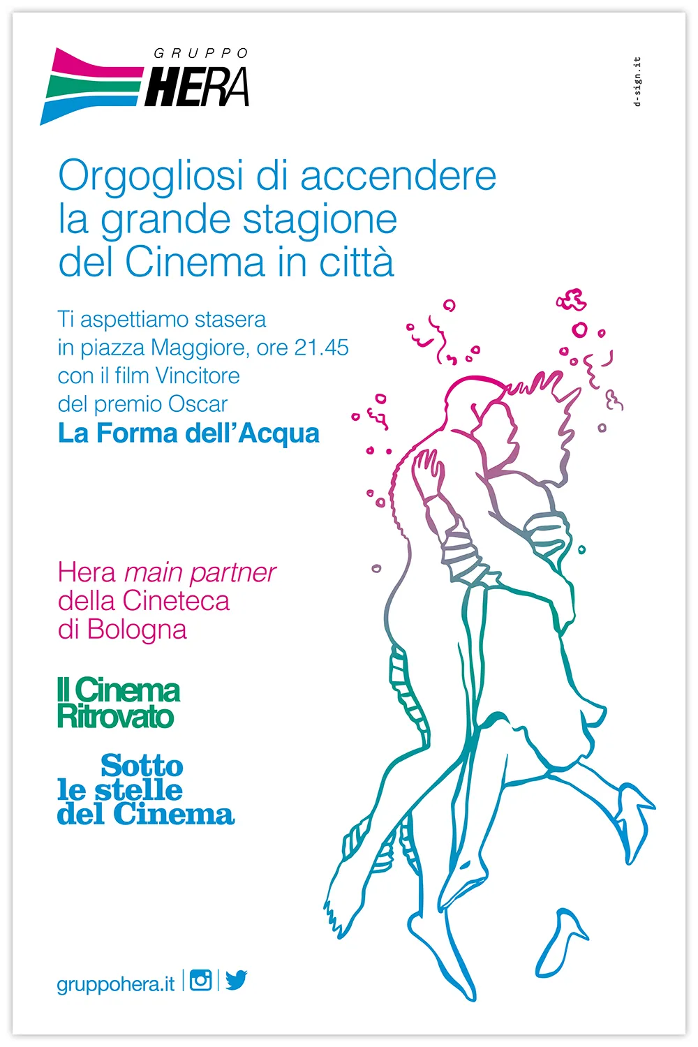 D-Sign con il gruppo Hera crea la campagna per il Cinema in Piazza di Bologna, del quale l’azienda bolognese è da sempre Main Sponsor. Oltre all’immagine istituzionale, con lo stesso stile, le declinazioni per gli eventi speciali svolti nella splendida cornice di Piazza Maggiore.