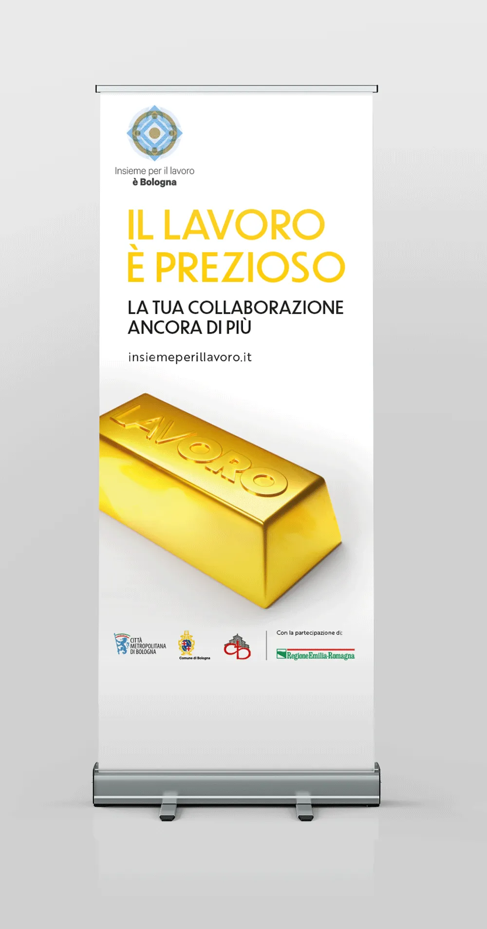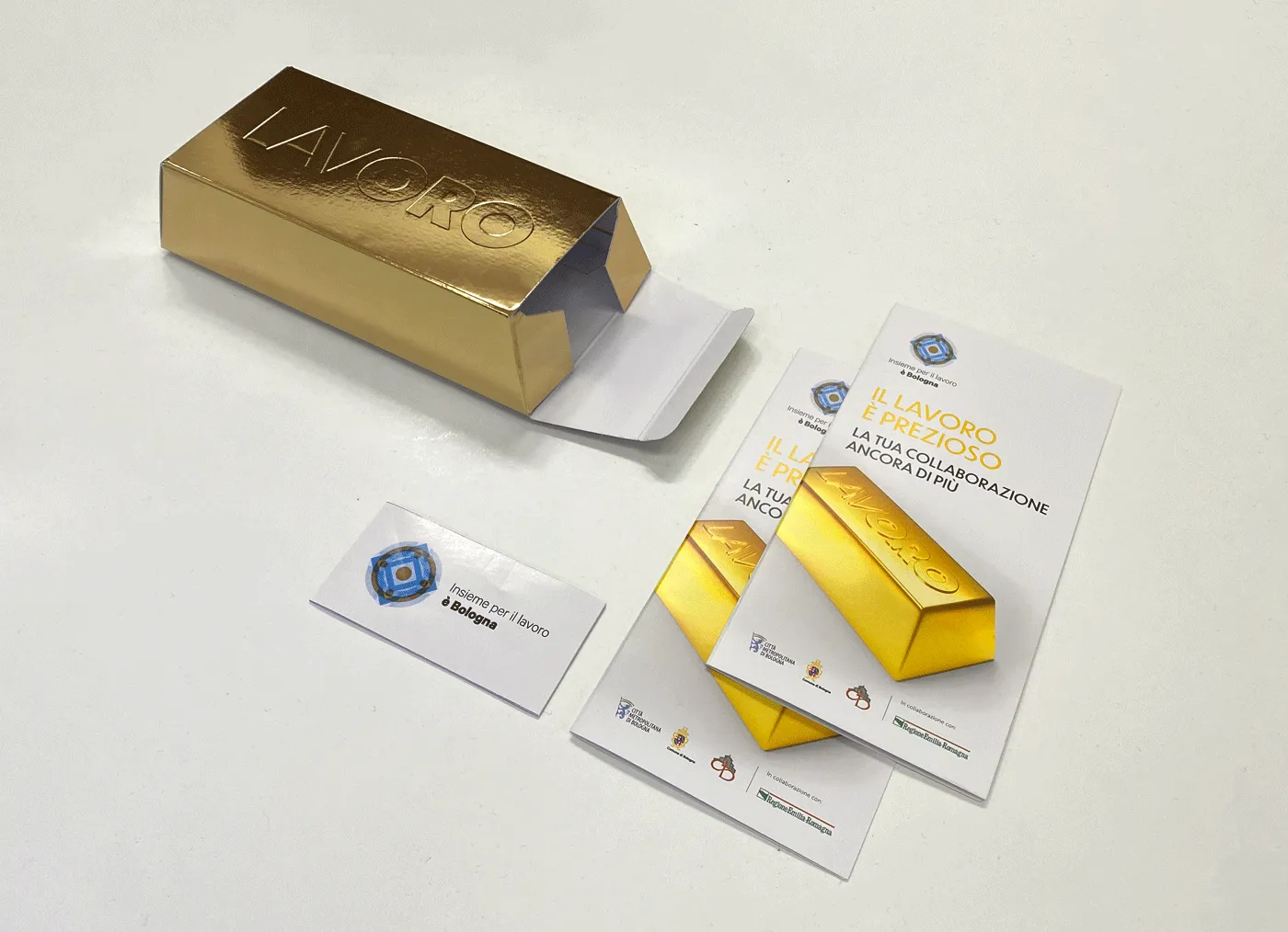 Tra i materiali sviluppati, oltre al roll-up istituzionale, un progetto in cartotecnica a forma di lingotto contenente un flyer, una lettera rivolta alle aziende/stakeholder, adesivi e braccialetti personalizzati.
