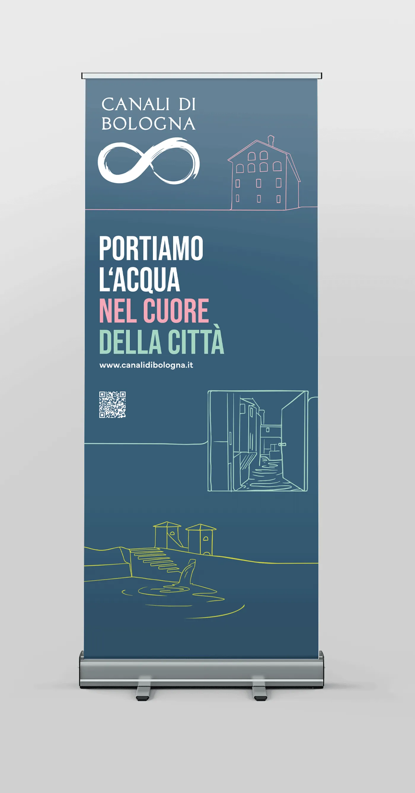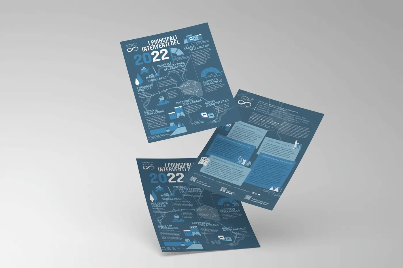 Abbiamo creato la nuova linea grafica per Canali di Bologna, il Consorzio che gestisce la rete dei canali originati dal fiume Reno e dal fiume Savena, attraversando tutto il centro di Bologna.