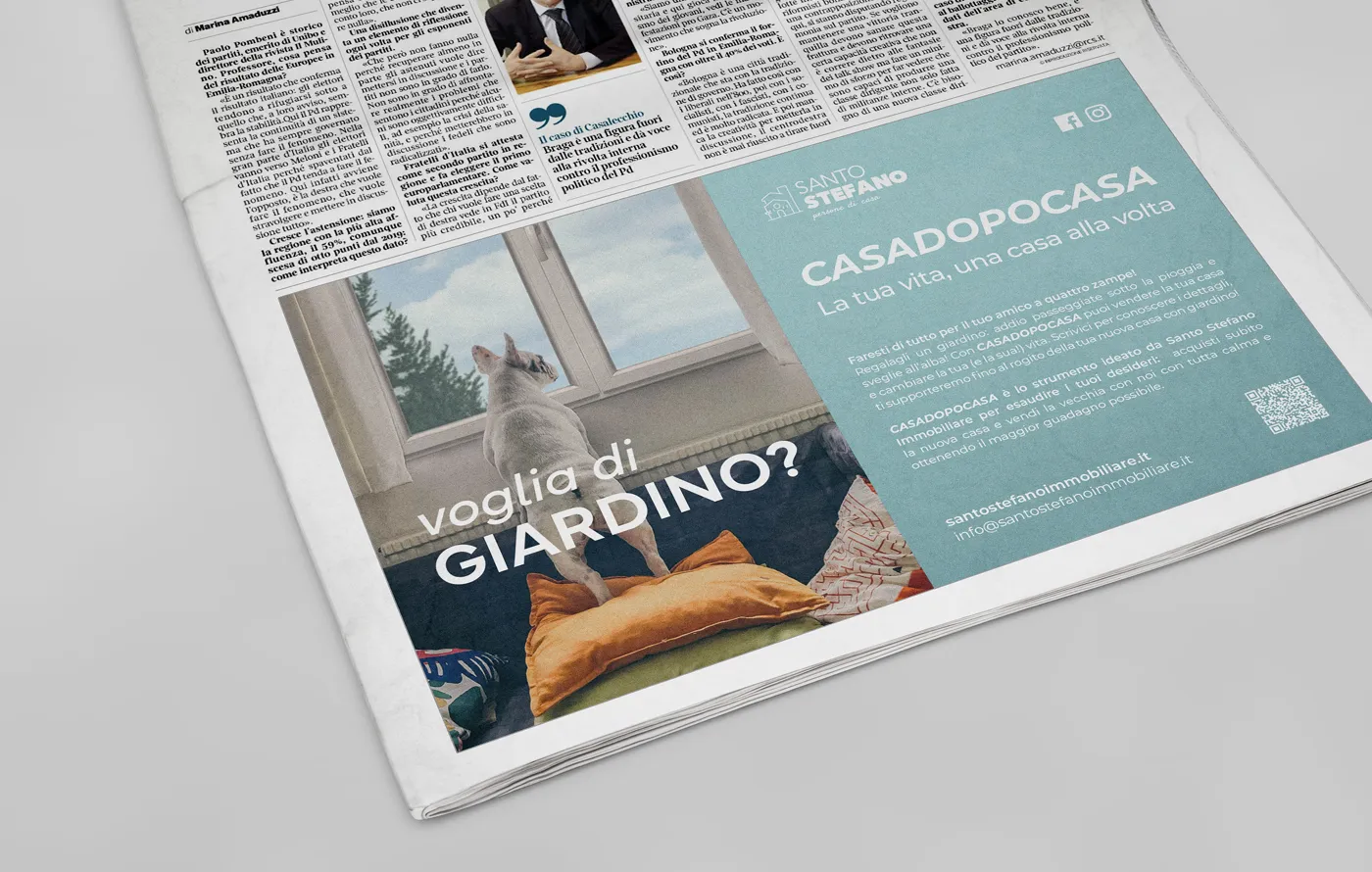 Santo Stefano Immobiliare presenta CasaDopoCasa, la soluzione ideale per chi vuole vendere, senza stress, la vecchia casa mentre acquista la nuova. La nostra campagna, ispirata all'estetica onirica di Wes Anderson e potenziata dall'AI generativa, è stata declinata su vari materiali stampa, mantenendo un tono leggero per mettere in evidenza i vantaggi per il cliente e raggiungere il target più ampio possibile.